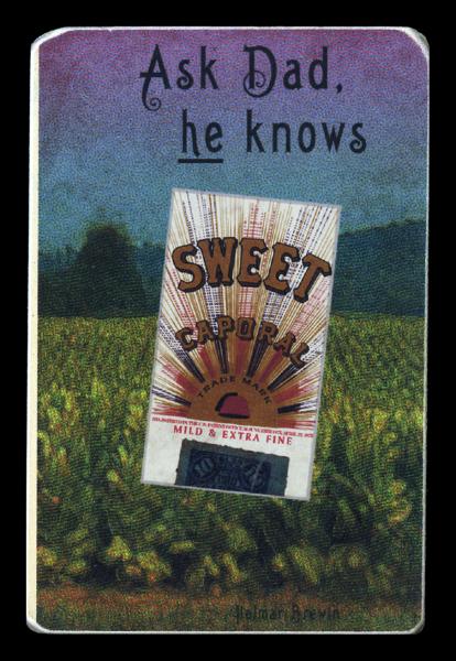 Seven layers make up a Helmar Oasis card. Each layer has to fit perfectly. It takes a long time to construct each card, then scuff it to make it seem well-worn; it's already well-loved, by us. Oasis is designed to evoke the Gaslight Style, a name applied to commercial trade signs of the 1870's through 1890's, in an era that succumbed to electric light. The essence of Helmar Oasis is depth. The pictures of the players arise in a shadowy light, to seem like they're almost emerging from another plane of existence. Each card is about 2.65" x 4". Gouache paintings by J. Scott Pedely.